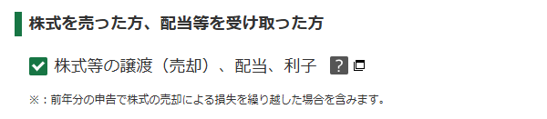 外国株の配当や、持株会の解散による株式売却がある場合は、こちらにチェックを付けます。