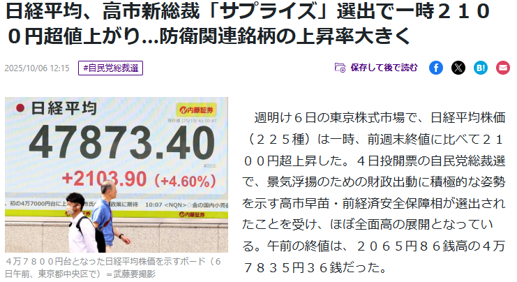 10/3の自民党総裁選で高市早苗氏が総裁となり、日本株は急騰しました。