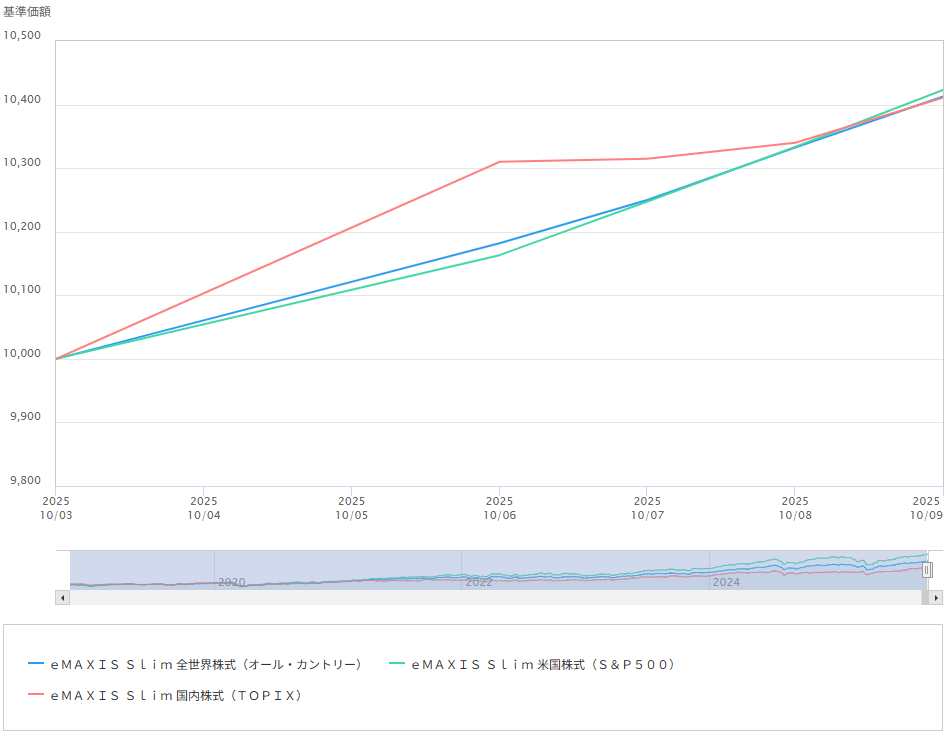オルカン、S&P500(米株)、TOPIX(日本株)のいずれも同じような結果。