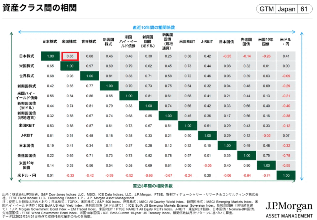 日本株と米国株は強い相関(0.65)であることがわかります。