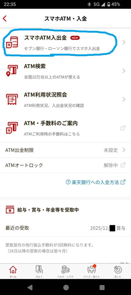 楽天銀行アプリを立ち上げて、「スマホATM・入金」をタップ。