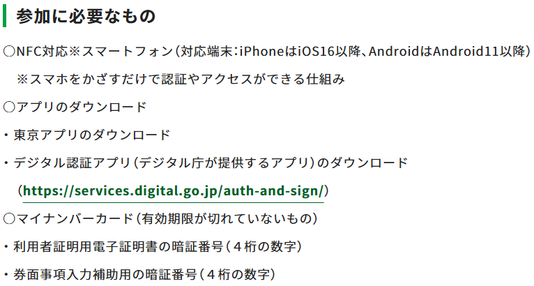 スマホ、東京アプリ、マイナンバーカード、暗証番号を用意しましょう。